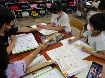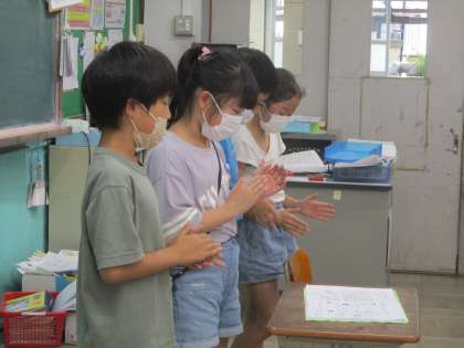 音楽の学習で、手拍子と4文字の言葉でリズムアンサンブルをしました。グループごとに「野菜」や「都道府県」などのテーマを決めて演奏しました。