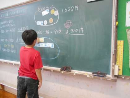 算数の時間に高学年チームでお金の学習をしました。お釣りの計算も暗算でできていました。ぜひ、普段の生活の中でも使っていってほしいです。