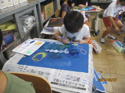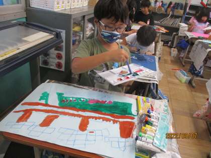 お話の絵を想像して、画用紙に描きました。絵の具で塗ったりクレパスで模様を描いたりと楽しい絵が出来上がってきています。完成がとても楽しみです。鑑賞するときには友達の「ここいいな。真似したいな。」というところをたくさん見つけてほしいと思います。