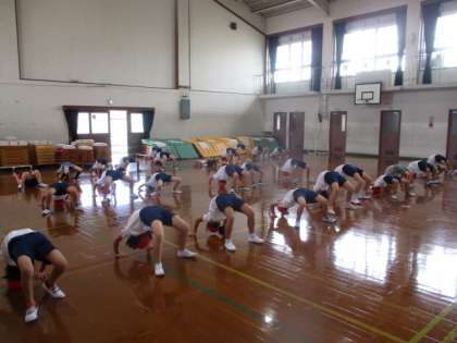 「起き上がり」、「ブリッジ」、「側転」、「ポーズ」・・・それぞれの技の完成度が上がってきています。たとえ難しいと感じる技についてもあきらめずに挑戦している3年生はきらきらとかがやいています!!いいですね。