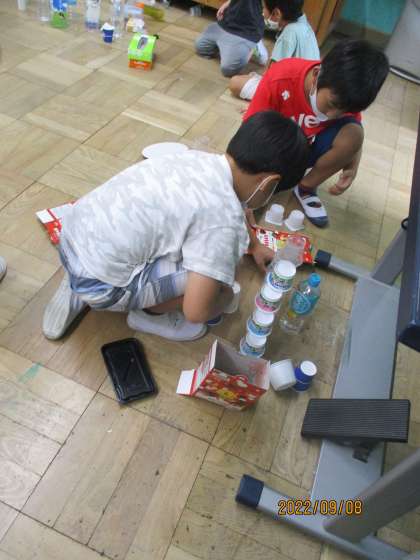 生活科の「あそんで ためして くふうして」の単元では生活にある廃材を使って、遊びをつくり出す活動をします。