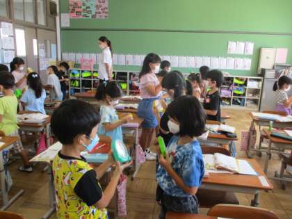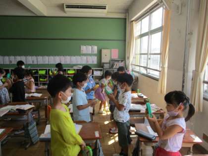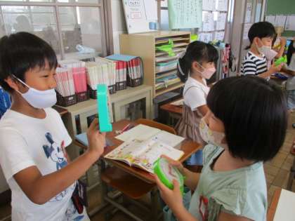 算数科の学習では、時計の読み方を勉強しました。時計には長い針と短い針があることや、長い針の場所によって「何時」「何時半」と読むことが分かりました。一人一人がミニ時計を持って、実際に針を動かしてみました。ペアの友達と問題を出し合いっこして、理解を深めることができました。