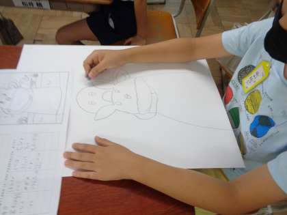 図画工作科で「お話の絵」に取り組んでいます。イメージスケッチをもとにいよいよ画用紙にかきはじめました。コンテを使って一本一本の線を大切にしながら表現していきました。重なりに気を付けたり、大きさに気をつけたり工夫が見られました。素敵な作品になりそうで今からとても楽しみです。