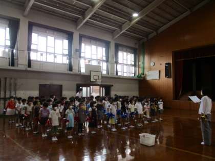 川岡小学校の150周年の記念式典がいよいよ、今週の土曜日に開かれます。1年生もお祝いの言葉の練習を頑張っています。今日は本番と同じように、ポンポンをもって練習しました。言葉と一緒に簡単な動作もつけています。全員で心を一つにして発表したいと思います。