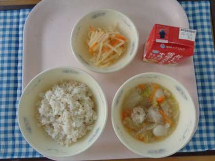 今日の給食は,麦ごはん・肉だんごのスープ煮・じゃがいものピりカラいため・牛乳でした。肉だんごをやわらかくするポイントは肉と調味料を混ぜてしっかりとこねて少し水を入れることです。