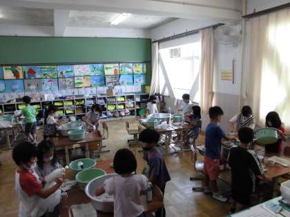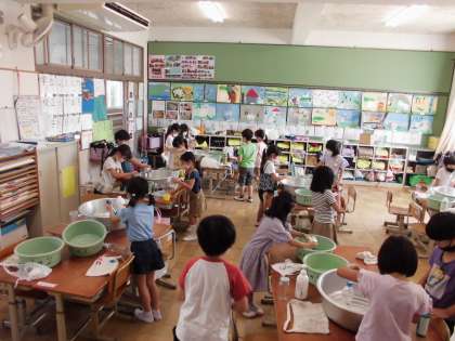 算数科で「おおきさくらべ」を学習しています。持ってきた空き容器を使って、かさを比べる活動をしました。一滴もこぼさないように、移し替えたり、コップに入れたりして比べていました。班で協力しながら、いろいろな容器で比べ合って、熱心に学習していました。