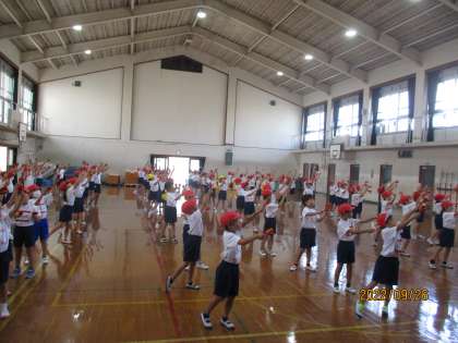 学年で集まってダンスの練習をしました。鳴子の鳴らし方や手の伸ばし方などをみんなで確認しました。もうダンスをしっかり覚えている子が多く、後は動きを全員で合わせていきます。「鳴子の音が揃うとカッコイイ。」とも子どもたちが言っていたので、鳴子の音にも気を付けていこうと思います。