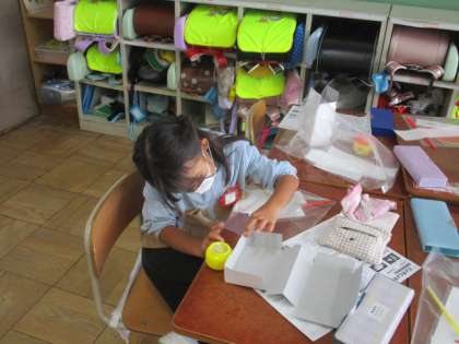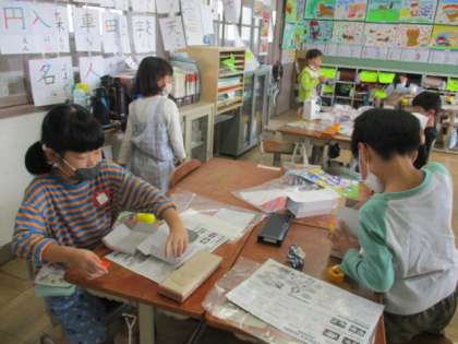 図画工作科の学習では、「にょきにょきとびだせ」の学習を進めています。ストローで息を吹き込むと、ビニール袋がふくらみ、箱からにょきにょきととびだします。初めに、箱を縦に開くか、横に開くかを決め、ストローとビニール袋でとびだす仕組みを作りました。分からないところは友達に教えてもらったり、「ここをちょっと持っていて」と手伝ってもらったり、楽しそうに作品作りに取り組んでいました。