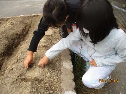 また、2年生の畑にダイコンの種を一人一粒植えました。いつ芽が出るのか楽しみです。