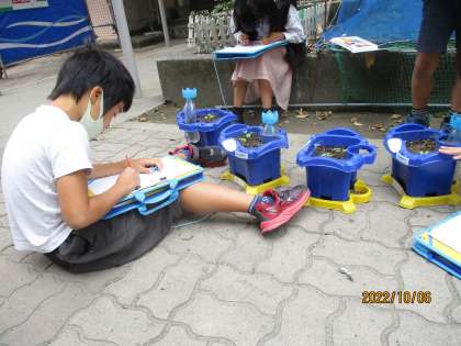 先週植えた野菜の種の芽が出ています。「ハートの形に似ているよ。」や「ホウレンソウの芽は英語のVの形に似ているよ。」など、たくさんのことに気付いていました。
