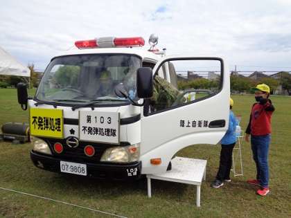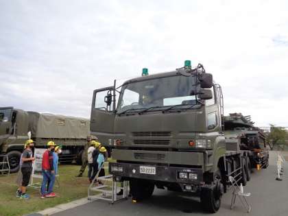 戦車や特大型セミトレーラー、不発弾処理車など様々な大型車両への乗車体験を行い、初めて乗る車両の高さに子どもたちは大興奮でした。
