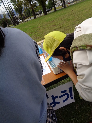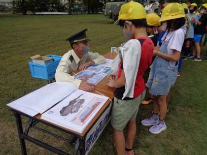 南極大陸の氷を実際に触らせてもらいました。氷に耳を近づけると、氷から南極大陸の遥か昔の空気の音が聞こえてきました。子どもたちは、南極大陸を肌で、耳で感じることができて感動していました。また、願いをかなえる石も触らせてもらい、子どもたちは自分のお願いが叶うようにと願いながら、石に触れていました。自衛隊員の方が、南極大陸に関するクイズを出してくださり、子どもたちは南極大陸について少し詳しくなることができました。