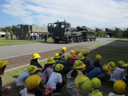 待ちに待った自衛隊の方々のお仕事に触れる機会がやってきました。たくさんの自衛隊員の方々が待ち受けて下さった事に、子どもたちは驚いた様子でした。