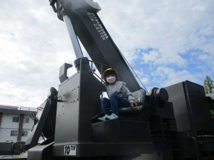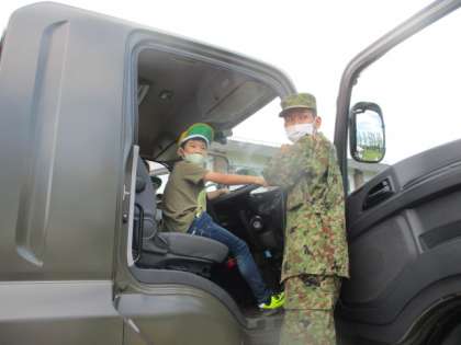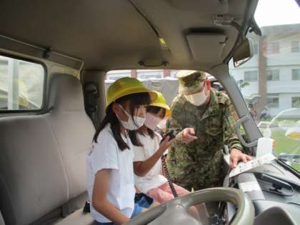 自衛隊の方々の案内で、敷地内に置いてある特別車両に乗ってみました。実際にスピーカーを使用させて頂いたり、運転席に入れて頂いたりと子どもたちは大興奮でした。