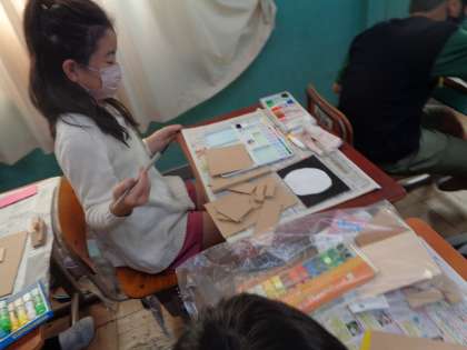 図画工作科の学習で前回のこぎりを使って切った木を組み合わせてどんなものが作れそうかを考え、作品づくりに取り組みました。絵の具を使って木に色をつけ、組み合わせていくとどんどんかわいい作品が現れてきました。完成が楽しみです。