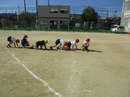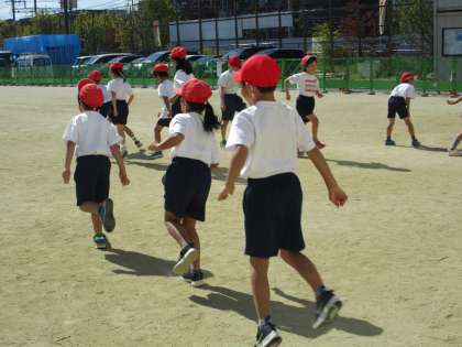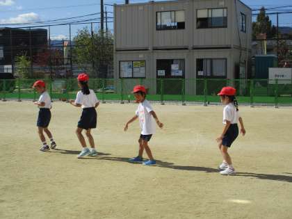 体育では「まねっこあそび」をしました。班のお友達のまねをしながら、線まで進むという活動をしました。子どもたちは、手を大きく動かしたり、かえるになってみたり、後ろ向きに歩いたり、ジャンプしたり・・・自由に動き、楽しんでいました。