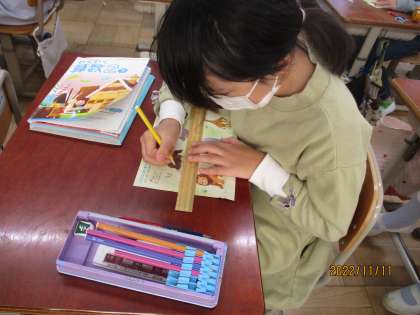 算数科では、「三角形と四角形」の単元に入りました。今日は点と点を直線でつないで、キリンやゾウなどの動物を囲みました。そこから3本の直線で囲まれている形は三角形といい、4本の直線で囲まれている形は四角形ということを知りました。