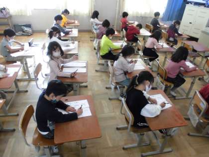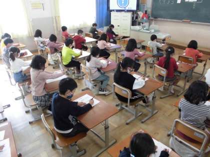 書写の時間に、フェルトペンで書初めをしました。手本をよく見て、「ともだち」と元気に書きました。ていねいに心を込めて書くことができました。