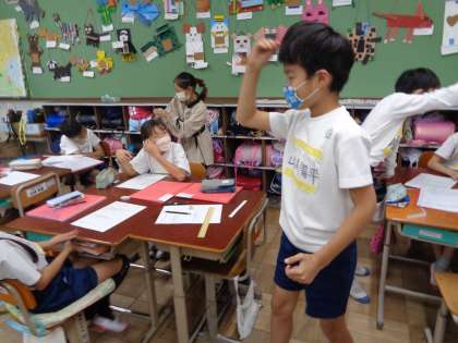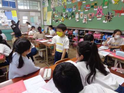 総合の学習で聴覚障害について学習しています。口の形で伝えると言葉が伝わるかを試した後、ジェスチャーで伝える活動を行いました。やっぱり音が聞こえるのは生活しやすいことに気づきがありました。