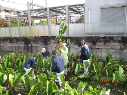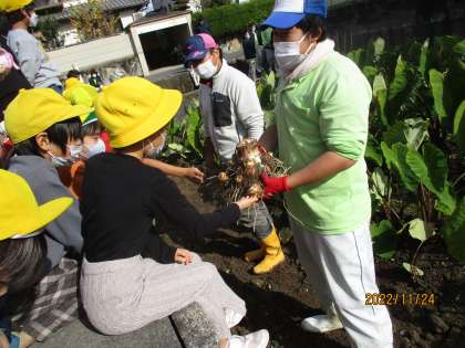 次はエビイモの収穫です。桂高校生が一生懸命掘ってくれて、たくさんのエビイモを収穫することができました。「形がエビにも似ているし、チューリップにも似てる。」と驚いていました。