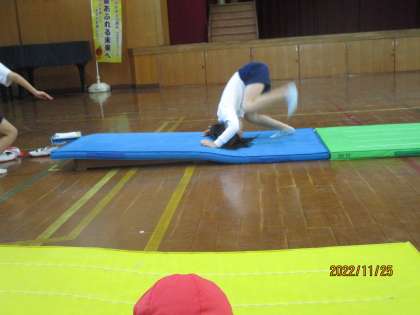 体育科の「マットあそび」の学習が進むにつれて、前まわりや後ろまわりがきれいにまわれるようになってきました。後ろまわりでは、まわった後に足の裏をしっかりマットにつけたり、手でマットをしっかり押したりすることができるようになってきました。