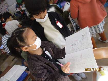 今日は登場人物やお話のあらすじを、自分で描いた絵を指し示しながら友達に説明しました。説明し終わったら友達からアドバイスをもらいました。「もっと登場人物を増やしたらいいんじゃない。」などのアドバイスをもらって、お話を作るのがより楽しみになっていました。