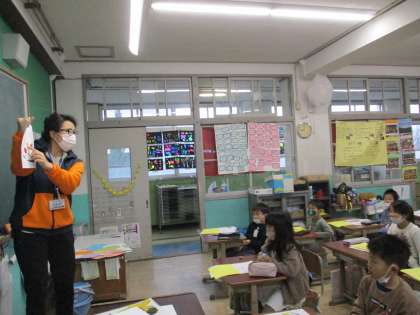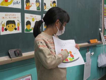 英語活動では、先週の集めた野菜でサラダをつくり、紹介しました。今回はALTの先生と一緒に活動したクラスもあり、2学期最後の英語活動を楽しく終えることができました。