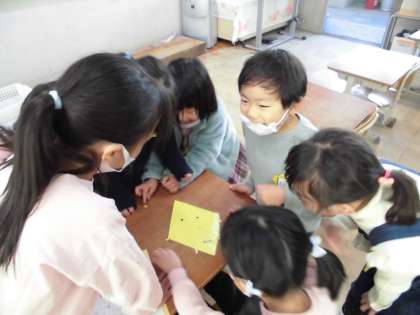 4年生のオリジナルキャラクターであるキラシャインさんの福笑いをもらいました。休み時間は,みんなで遊んで大笑いしています。「自分たちでも作りたい!」と言って作っている人もいました。4年生と交流できて,嬉しそうです。