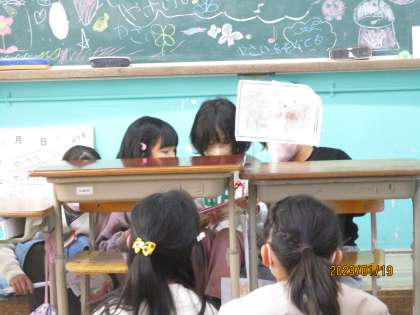 クイズ係さんはクイズラリーを企画して、教室や廊下にたくさんのクイズを貼ってみんなに解いてもらっていました。読書係さんは本の読み聞かせ。ペープサートもあって、とても分かりやすかったです。最後にはしおりをプレゼントしていました。