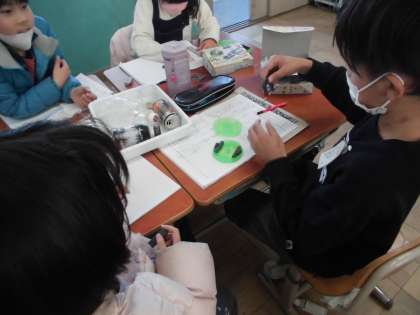 「じしゃくで引き付けるものにはどんなものがあるのだろうか。」という課題を受けて、プラスチックやわりばし、空き缶、はさみといった身の回りのものに磁石を近づけて実験しました。グループで結果から分かったことを交流しました。電気が流れるものとは少し違うと気づくなど、意欲的に活動できました。
