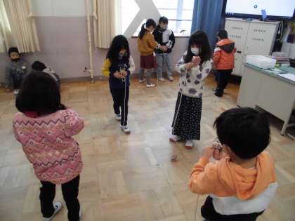 生活科で「ふゆとともだち」を学習しています。木ゴマに自分で色をつけました。回してみると,塗った色が混ざって美しくなり、歓声が上がりました。何度も練習して、上手にこま回しができるようになりました。