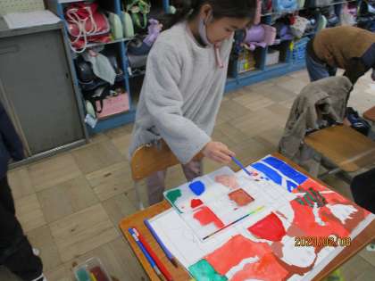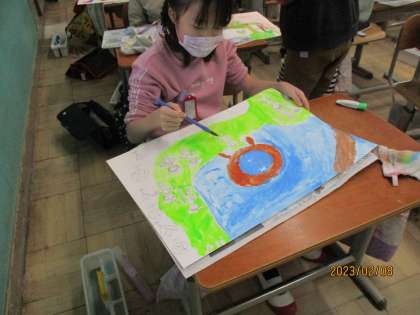 絵具で塗ったり,コンテやクレパスで塗ったり,または,タンポでトントンしたり,コンテを削ってぼかしたりしています。さらに,水をつけて絵具をおいてぼかす技法など,様々な技法を教えて,その中から自分の思いにあった技法で楽しく絵を描いていました。出来上がりが楽しみですね。
