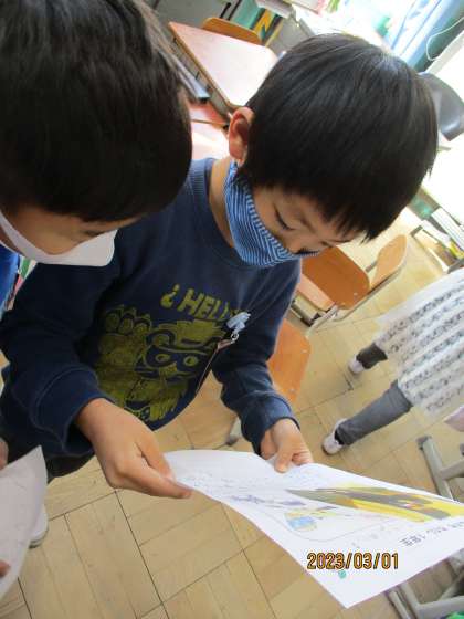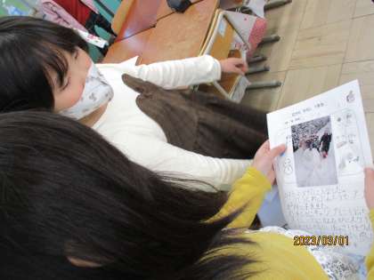 1年生の交流をしました。「入学した時は緊張していたよ。」や「ランドセルを背負うのがうれしかったよ。」と、1年生の時の様子を詳しく話していました。「この写真はどこで撮ったの。」などの気になった質問もしていました。