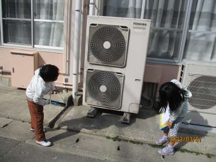 図画工作科の「友だちみつけた!」では、身の回りから顔に見えるものをたくさん見つけました。車を前から見たり、室外機を横から見たりしてたくさん顔を見つけていました。「お家でもたくさん顔を見つけるね。」と意気込んでいました。