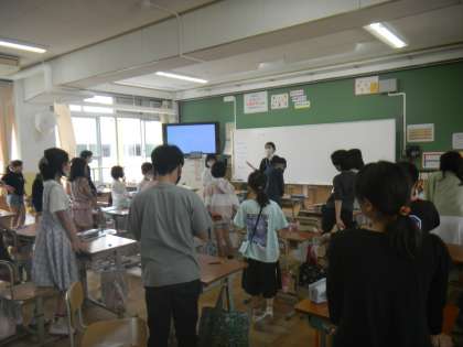 教育実習生の先生と、外国語の学習に取り組みました。自分の名前のつづりを友達に紹介できるように、まずはアルファベットの復習から!教室から、子どもたちの元気なABCソングの歌声が聴こえてきました。