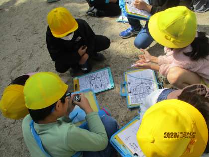 今日は西コースを探検しました。「郵便局があるな。」とみんなで確認したり、方位磁針を使って方角を調べたりしました。校区探検を通して、川岡小学校には何があるかをみんなで交流しました。