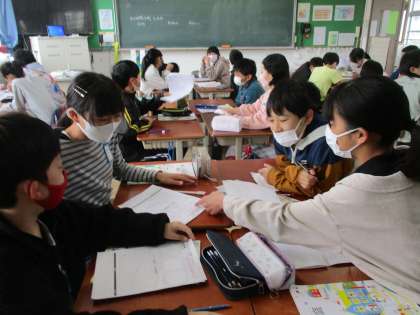 「夕ご飯の後に妹の世話をして、お母さんにゆっくりしてもらえる時間をつくったよ。」「早起きをして、ごみ出しを手伝ったらいつもよりも少しゆっくり家族で朝ご飯を食べることができたよ。」「少しの工夫で家族との時間ができて、喜んでもらえて嬉しかった。」など、家族とのすてき時間を実行して気づいたことを報告しました。家族との楽しかった時間を思い出し、思わず笑顔があふれていました。