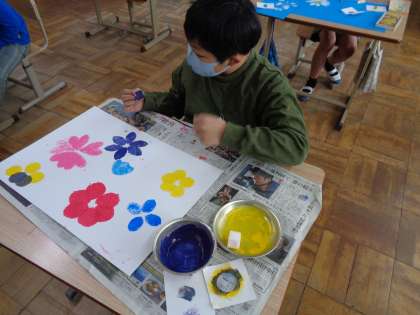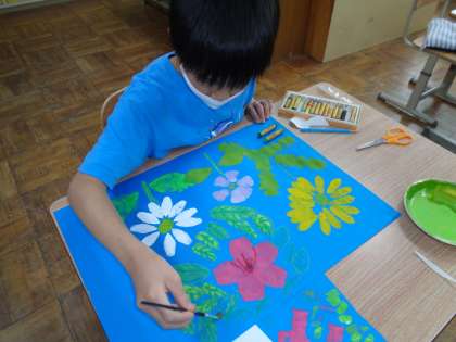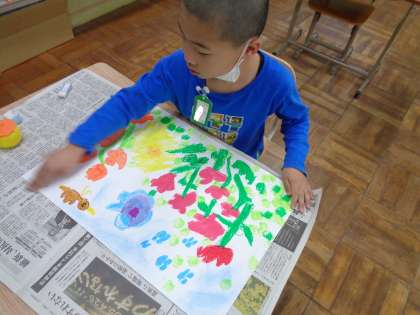 スポンジに絵の具をつけてスタンプしたり、丁寧に色を塗ったり、それぞれが自分で考えて素敵なお花を表現しました。