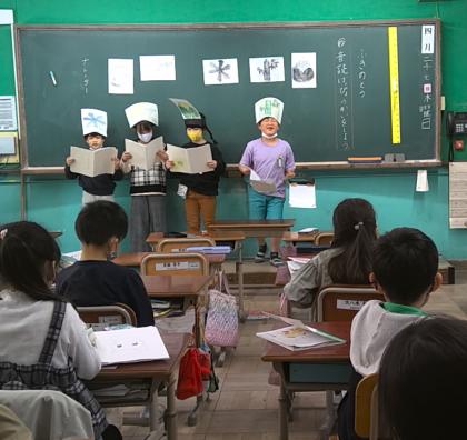 国語「ふきのとう」の学習で、音読発表会をしました。班の友だちと話し合い、きょう力して練習する姿はとてもよかったです。発表会では、同じ役でも読み方の違いに気づき、今後の音読に生かそうとしていました。