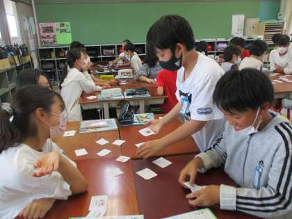 外国語では、日本各地のお祭りでどのようなことができるのかをカードで組み合わせるマッチングゲームをしました。カードがマッチングすると「ナイス!」と嬉しそうに友達に声をかける様子がありました。