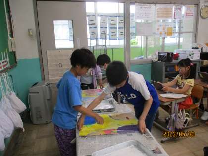 図画工作科の「わたしの6月の絵」の最終仕上げに、タコ糸と白い絵の具を使って雨を降らせました。「もっとたくさん降らせた方がいいかな。」や「もっと細い雨にしたいからあまりはじかないで。」など、ペアで話し合っている姿も見られました。みんなとても素敵な、大事にしたい作品が完成しました。