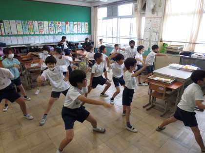 お手本の動きに合わせて何度も実際に踊って動きを覚える子。
