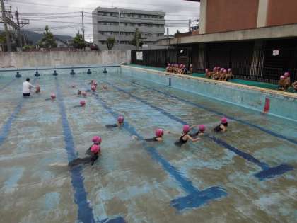 体育科で「みずあそび」の学習をしています。プールでお風呂屋さん(顔を3回洗う)をしたり、プールを一周回ったり、楽しく活動していました。水の中で動物に変身する遊びでは、ワニに変身しました。プールの中に、かわいいワニがいっぱい歩いていてる様子を見て、みんな笑顔になりました。