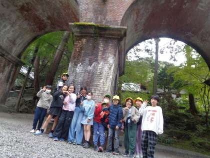 昼ご飯を食べ終わり、午後からは蹴上から南禅寺、水路閣、インクラインの方面を中心に見学を行いました。琵琶湖疏水の第1トンネル入り口や出口、ねじりまんぽにも扁額が掲げられていました。「次の扁額は何て意味ですか。」と熱心に質問してくれる子どもたちの学習への意欲に驚きました。また水路閣が自然との景観とマッチしていることにも感激している児童も多く見られました。
