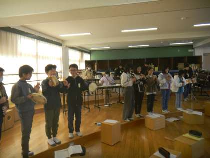 初めは自分の担当している楽器を演奏することに必死でしたが、だんだん慣れてくると、まわりの音をよく聞いて、「みんなでひとつの曲を作り上げる」ことを意識するようになってきました。最後の音がピシッとそろって終わると、「やったあ!」という声も聞こえてきました。みんなの心がひとつになった合奏でした。