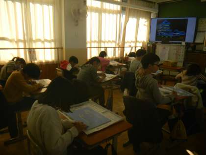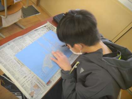 5年生は図工「ほり進めて刷り重ねて」の学習で一版多色刷りに挑戦します。今は、多くの子どもたちが、彫刻刀を使ってほり進める活動に取り組んでいます。どの部分をどのような太さで彫れば自分の表したい名城・名跡の迫力が伝わるかを考えながら、集中してがんばっています。しいんと静まり返った教室に、子どもたちが板を彫る「シュッ」という音が響いていました。