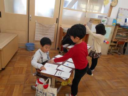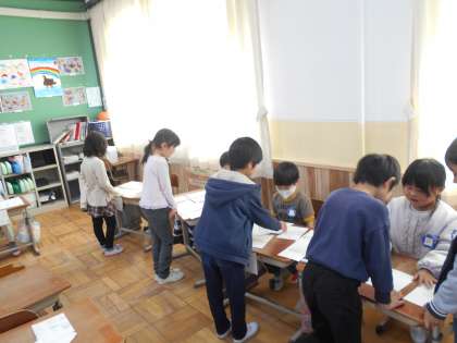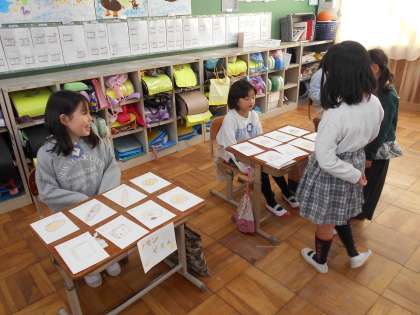 国語科の「ものの名まえ」で、ものの名前には一つ一つの名前と、まとめてつけた名前があることを学習しました。そのものの名前を集めて、一人一人お店屋さんを開きました。店員さんとお客さんでやり取りをしながら、楽しんで活動していました。