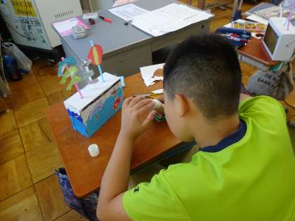 6年生は図画工作科で立体作品に取り組んでいます。クランクを使って動く仕組みを考えて、形作っています。よりリアルになるように、細かい部分まで切って貼ったりとより良い作品になるように集中して取り組む事ができました。
