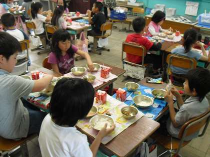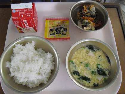 今日の給食は、ごはん、牛乳、かきあげ、かきたま汁、黒大豆でした。えびやちくわにたまねぎ、にんじん、三度豆、ひじきなどたくさんの具材でつくられた栄養満点のかきあげです。食缶に残った最後の一かけらまで競いあって分けあい、おいしくいただきました。