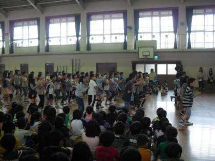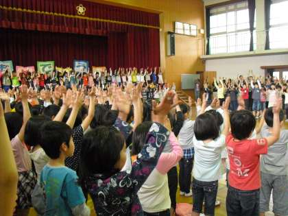 今日は1年生をむかえる会がありました。6年生のお兄ちゃん、お姉ちゃんに手をひかれながら入場してきた1年生。各学年からいろいろと工夫をこらした出し物やプレゼントをいただき、とてもうれしそうでした。